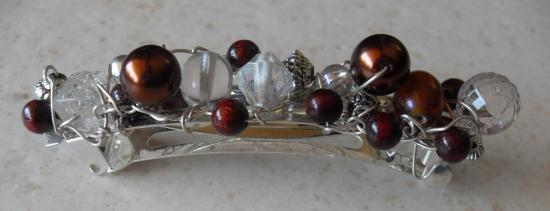 Barrette métal, perles marrons et blanches, création artisanale unique.