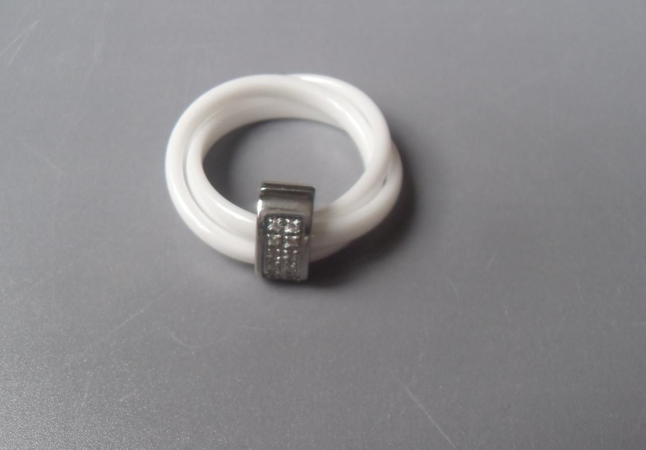 Bague 3 anneaux céramique blanc, et carré argent et strass blanc.