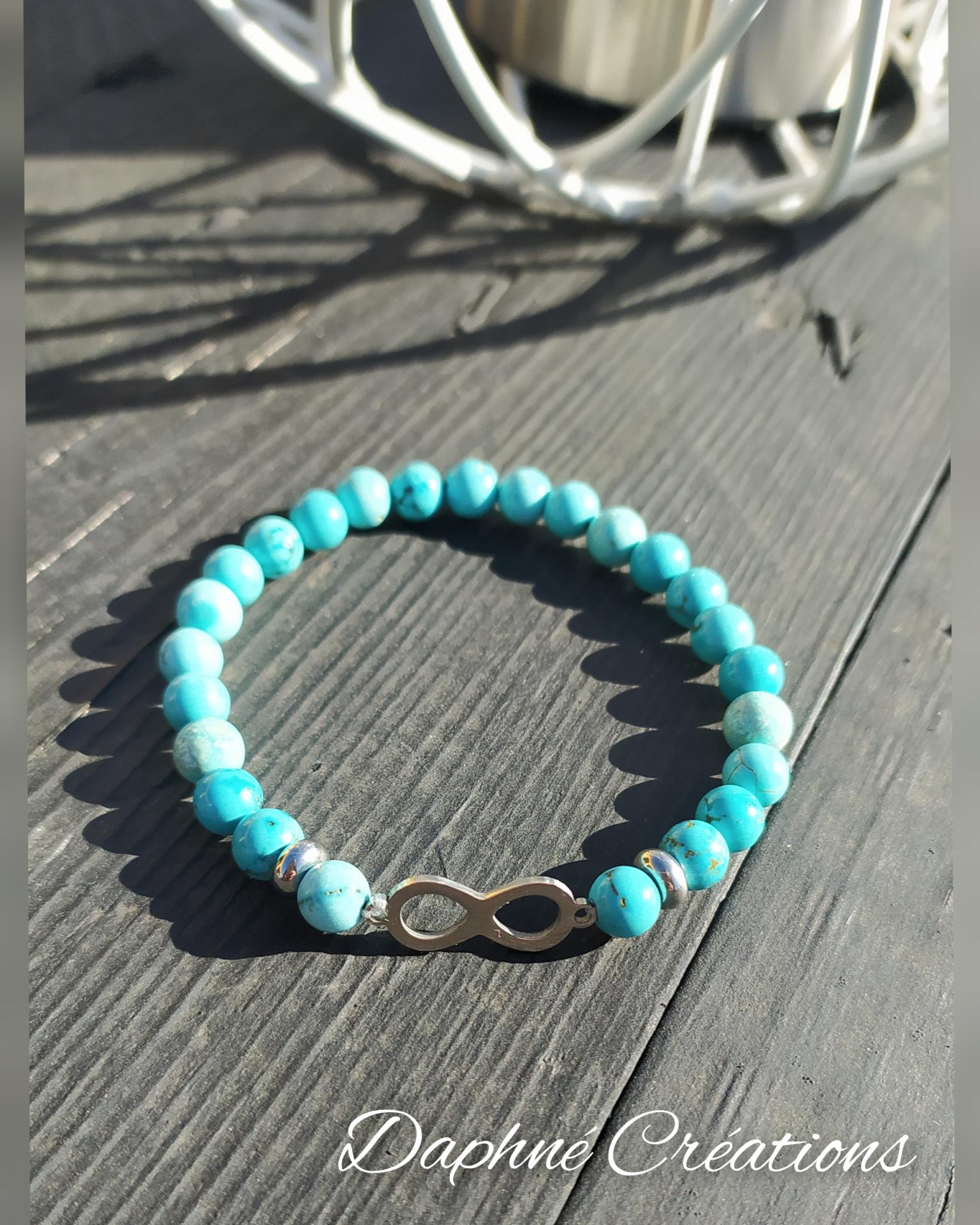 Bracelet en pierres naturelles, turquoise, perles et infini en acier inoxydable, élastiqué. Daphné créations.