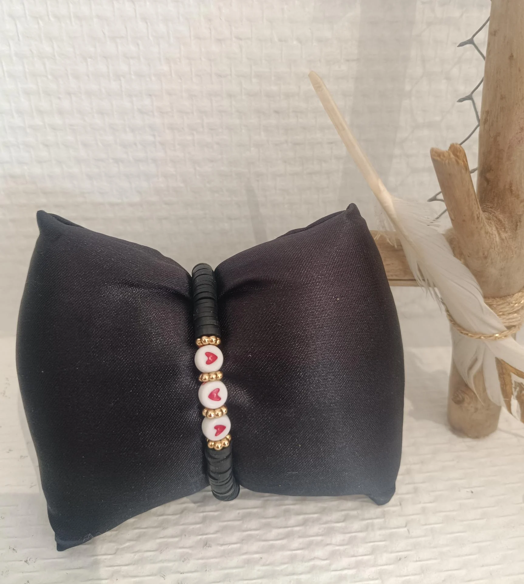 Bracelet perles rondelles heishi noir-blanc et motif coeur rouge, élastiqué, Daphné créations.