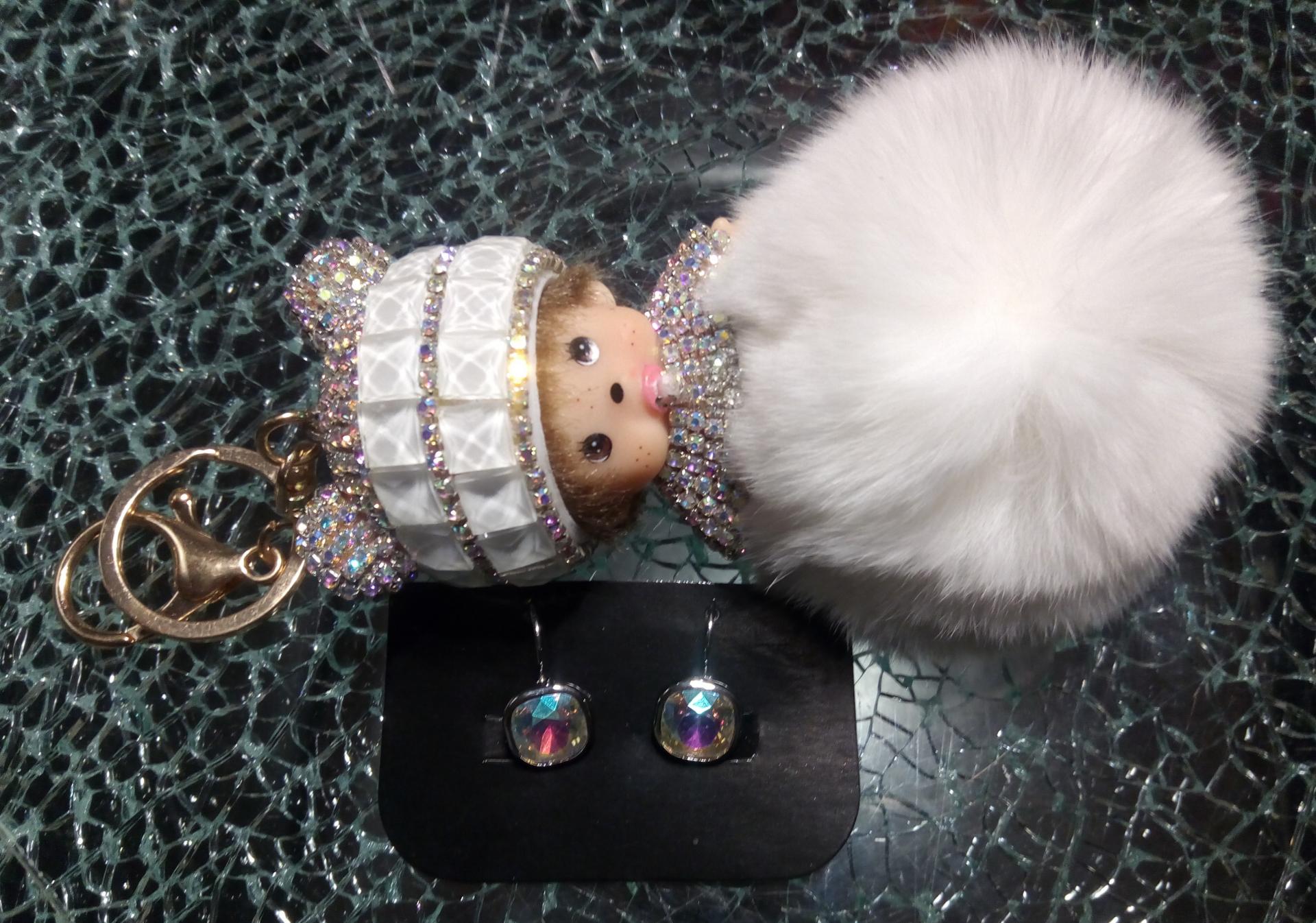 comprenant des boucles d'oreille carré strass blanc reflets AB et kiki pompon blanc.