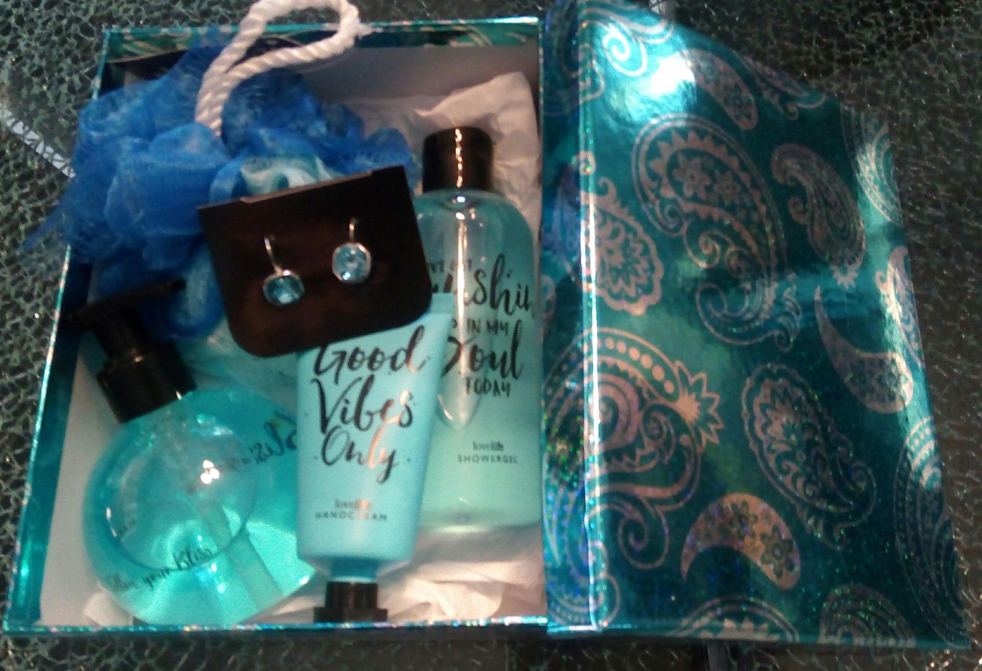 Coffret cadeaux turquoise, produits cosmétiques, boucles d'oreilles et kiki strass.